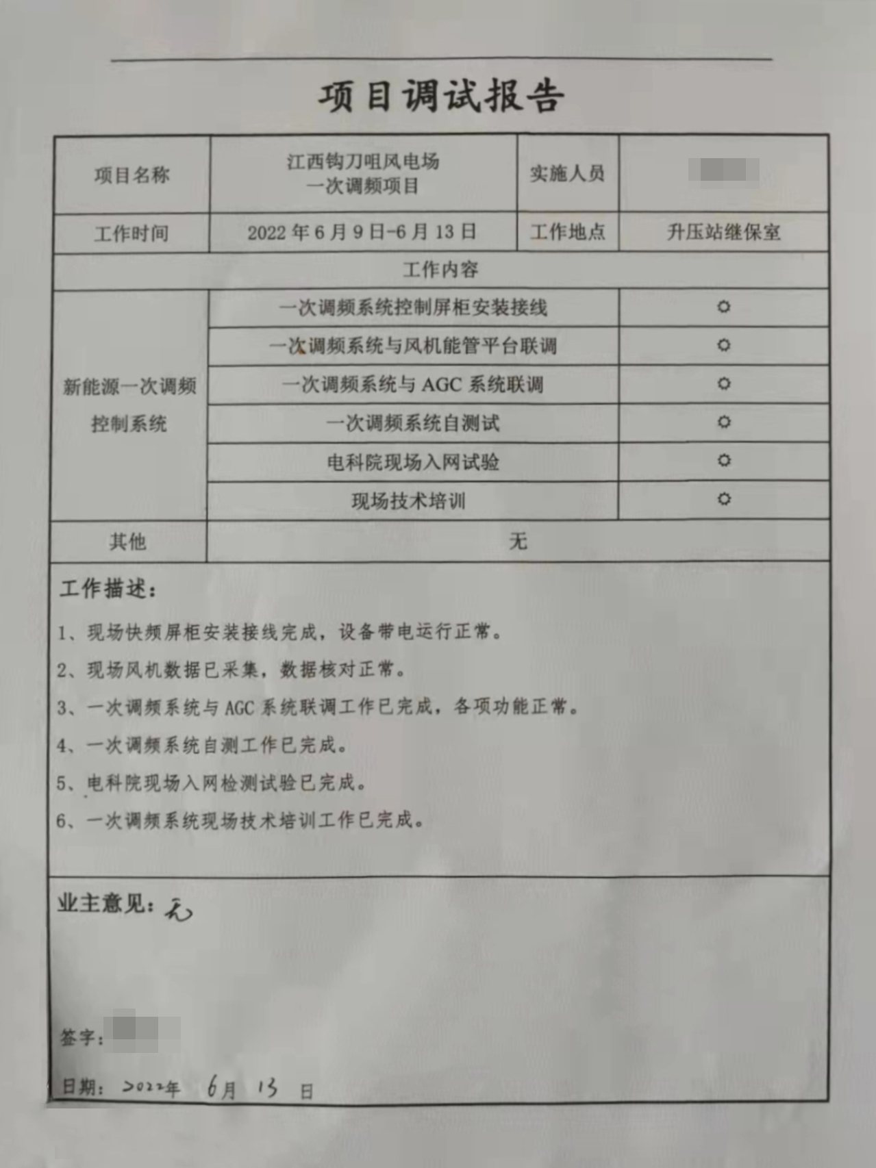 2022年6月13日鸿普惠承接的江西龙源钩刀咀风电场一次调频改造顺利通过入网检测!